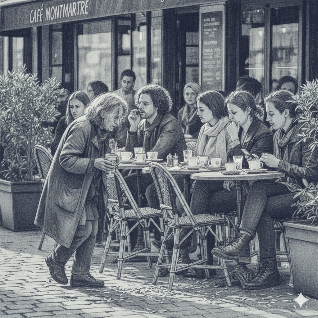Pasaba entre las mesas sin hacer ruido, y se agachaba de cuando en cuando. No pedía nada y nadie la miraba, iba en silencio arrastrando su cuerpo y su necesidad. Cuando acabó se marchó solitaria.